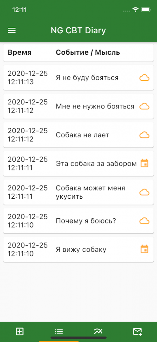 Если вы проходите когнитивно-поведенческую терапию, это приложение, безусловно, для вас. NG CBT Diary будет помогать вам в когнитивно-поведенческой психотерапии каждый день, изо дня в день. С помощью этого приложения вы сможете записывать события, ваши мысли, эмоции и поведение, анализировать их на графиках и отправлять отчеты своему терапевту. Поскольку NG CBT Diary установлено на вашем мобильном телефоне, ваш дневник всегда с вами. Вы никогда его не забудете. Вы сможете делать заметки в любом месте, в любое время.